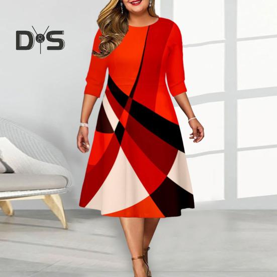 Платье А-силуэта свободного кроя с круглым вырезом большого размера, модное вечернее платье миди с геометрическим принтом, женская одежда 3XL красный