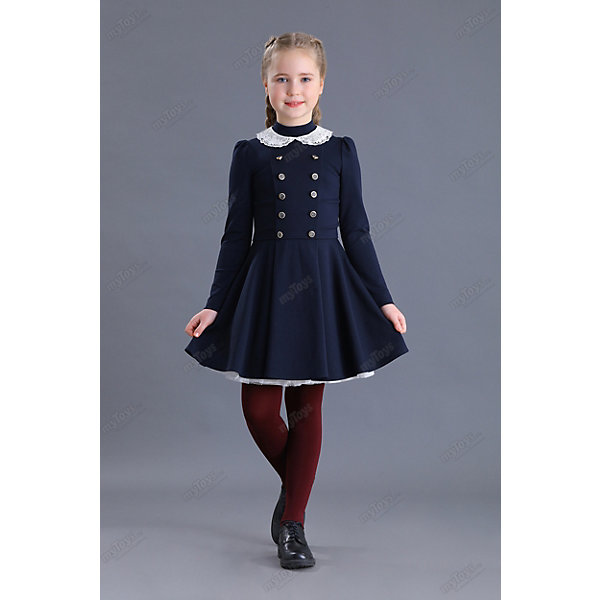 Платье изготовлено из костюмного трикотажа. Рукава длинные, юбка-солнце. Контрастный кружевной воротник при желании можно снять при помощи удобных пуговиц. Лиф отделан фирменными пуговицами.