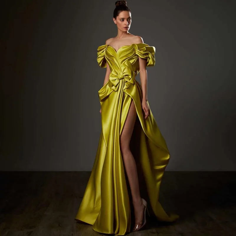 Платье атласное с открытыми плечами и бантом, Длинное Элегантное желтое формальное платье с оборками и разрезом, для свадебной вечеринки, в...