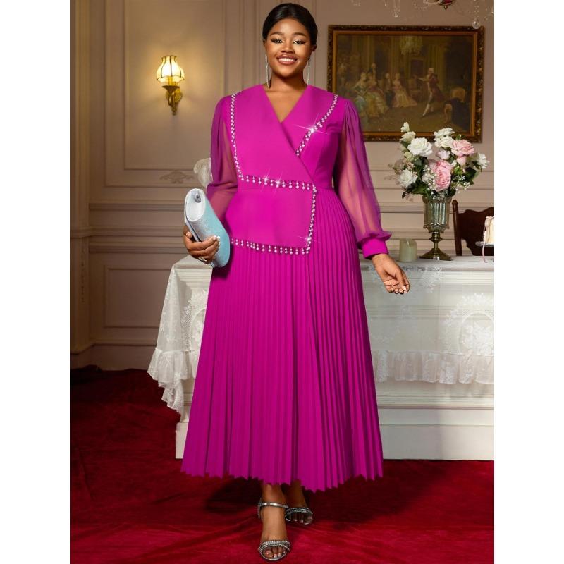 Платье больших размеров с длинным рукавом, однотонное, с бусинами, средней посадки, африканское женское вечернее платье для вечеринок, плиссированные платья для свадеб 3XL ярко-розовый