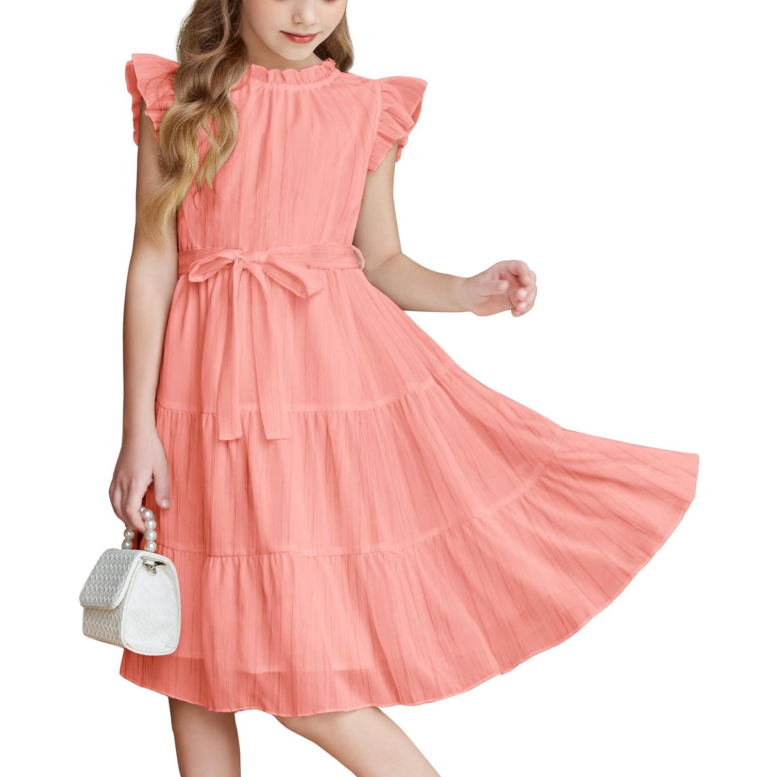Платье для девочек, однотонное, с круглым вырезом, завязывающимся на талии, с оборкой по подолу 160 арбуз красный