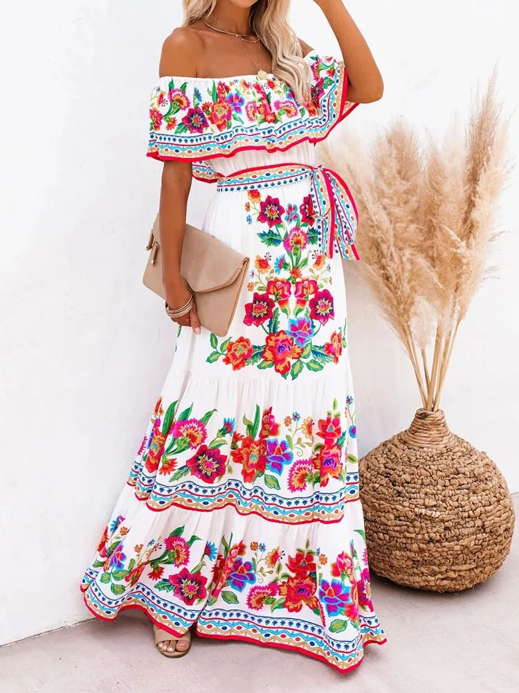 Платье женское длинное с открытыми плечами, пикантное элегантное пляжное вечернее в стиле бохо, с цветочным принтом, на шнуровке, с оборками...