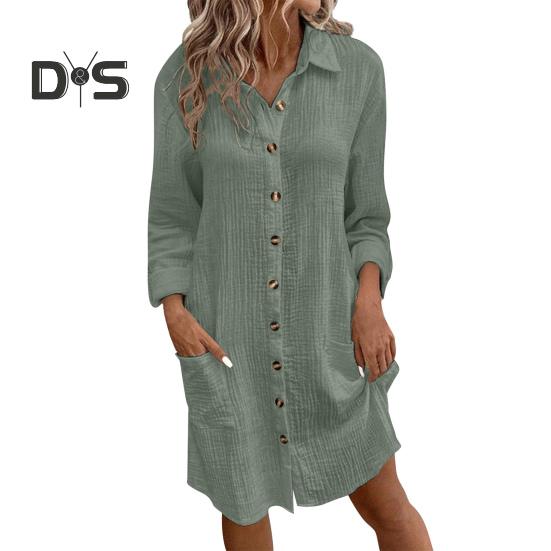 Платье женское осень-весна с отложным воротником, свободные длинные рукава, однобортное, однотонное, рубашечного типа, OL, миди-платье для поездок на работу XXL зелёный