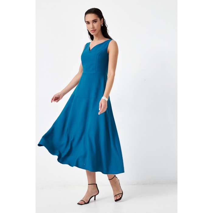 Платье на бретелях, отрезное по линии талии выполнено из вискозной ткани с крэш-эффектом. Изделие, прилегающее в области груди и свободное в области бедер. Нижняя часть платья по силуэту колокол с кокеткой. Лиф двухслойный с красивым женственным вырезом и рельефными швами от проймы. По среднему шву спинки застежка-молния.