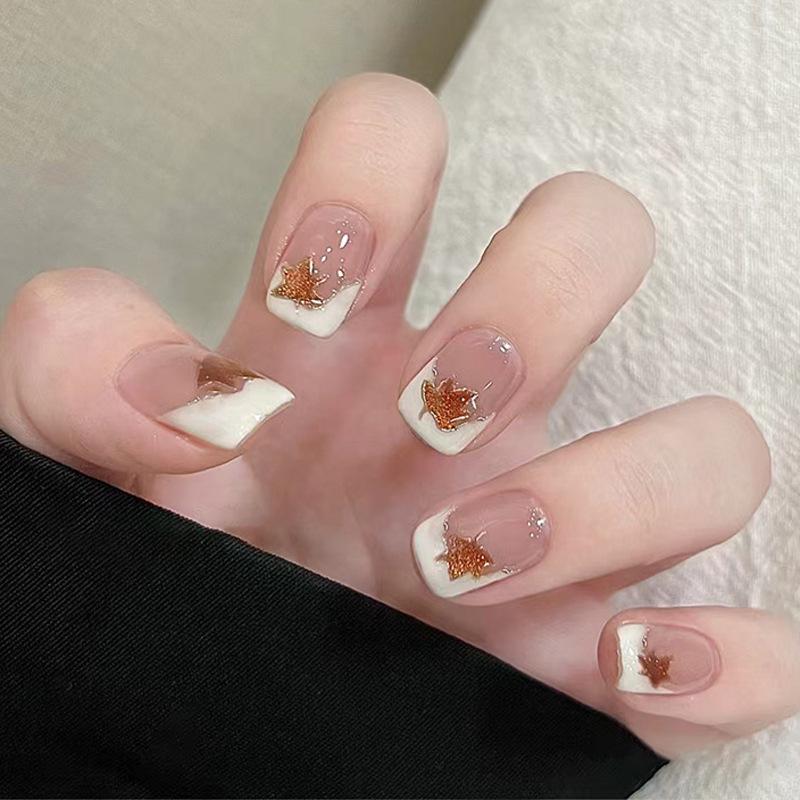 Gold Edge Maple Leaf White Nail Stickers: Sheer, Short, Simple, Wearable Full-Size False Nails.