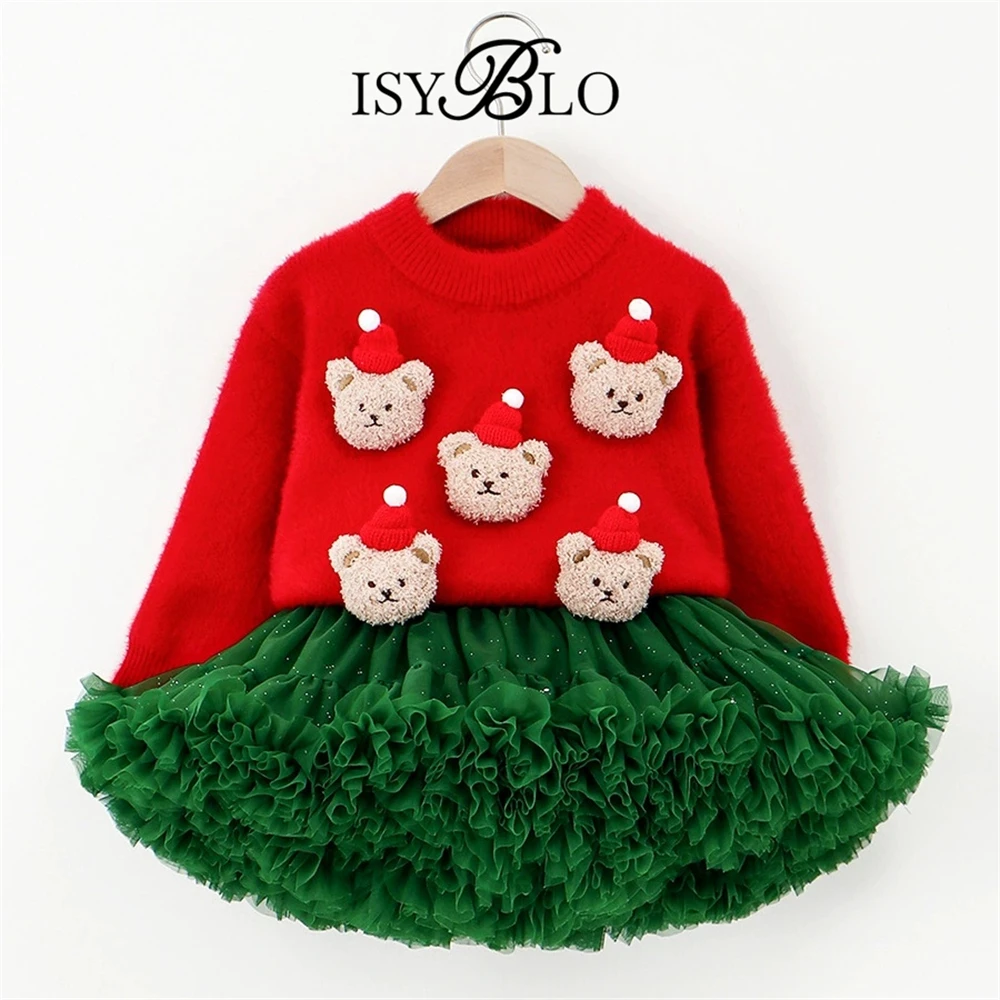 Sweet Bear Sweater & Tutu Dress for Chidren Chrsitmas Gift Dresses Girls Party Red Sweater and Puffy Skirt