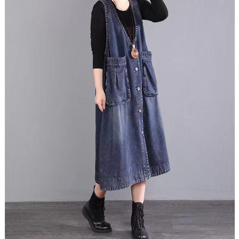 Платье-жилет свободного кроя из денима с большими карманами — корейский стиль средней длины на весну 2024 г. L (120-140 Jin recommended) синий