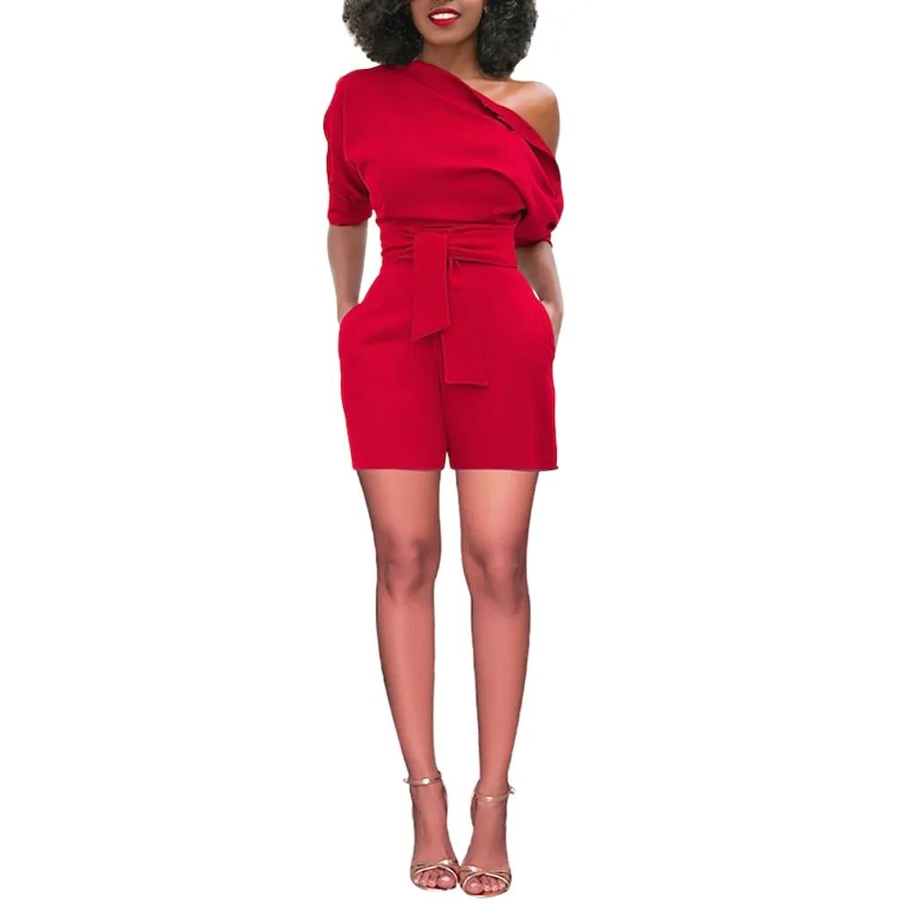 Женский пикантный однотонный комбинезон с открытыми плечами и коротким рукавом с поясом, облегающие комбинезоны, женский летний Модный ком...