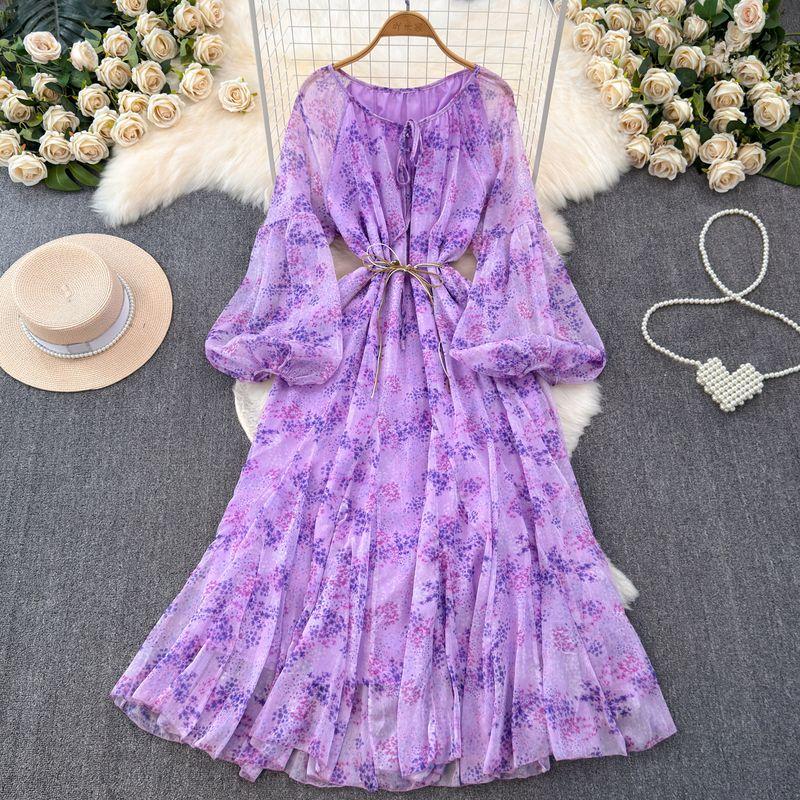 Платье из шифона с цветочным принтом в французском стиле для первого свидания, розовое, с круглым вырезом, весна и осень 2024, новая коллекция, атмосферное, элегантное платье для чаепития Purple All yards