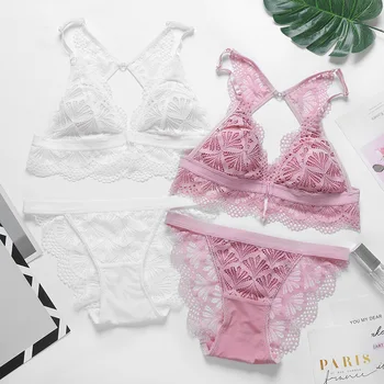 Sexy Beauty Back Bra Ultra-thin Triangle Cup Women Underwear Set Lace Front Closure Pink Lingerie Wire-Free Sweet Bralette Sets