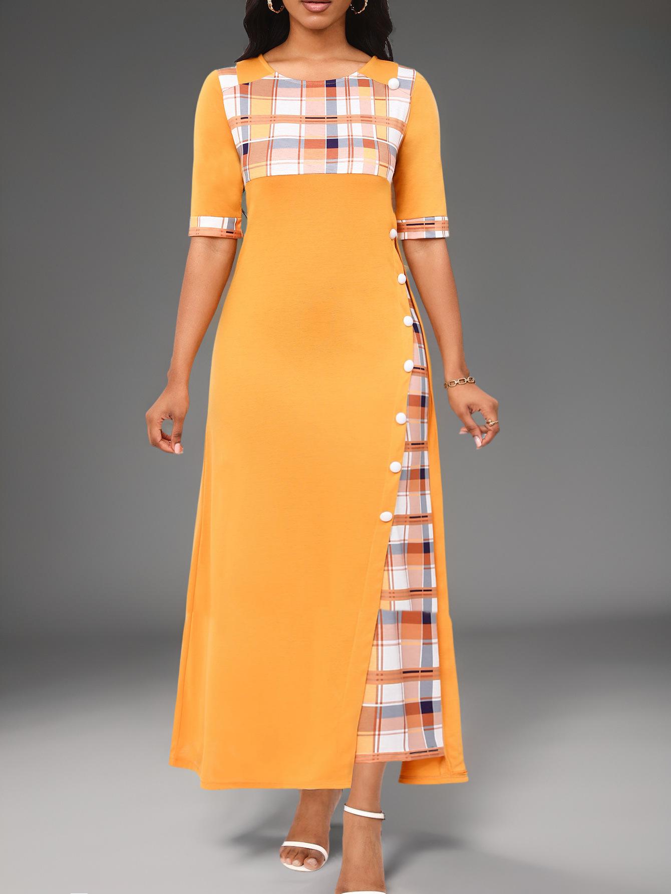 Платье миди с круглым вырезом, рукавами средней длины и нерегулярным подолом в стиле колор-блок L жёлтый