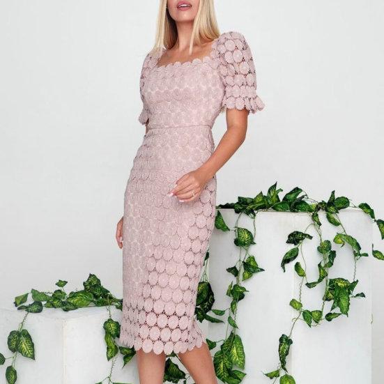 Платье миди с открытой спиной, открытыми плечами, цветочным декором, длиной до середины икры, с короткими рукавами, с открытой спиной и разрезом M розовый