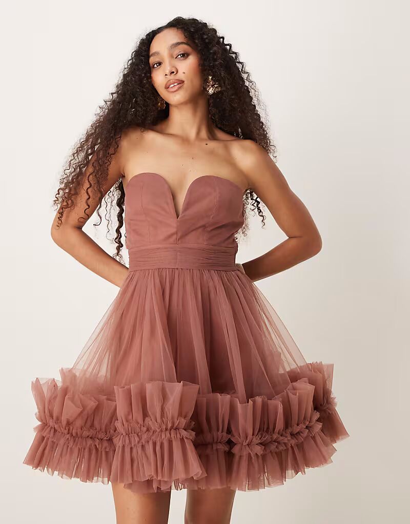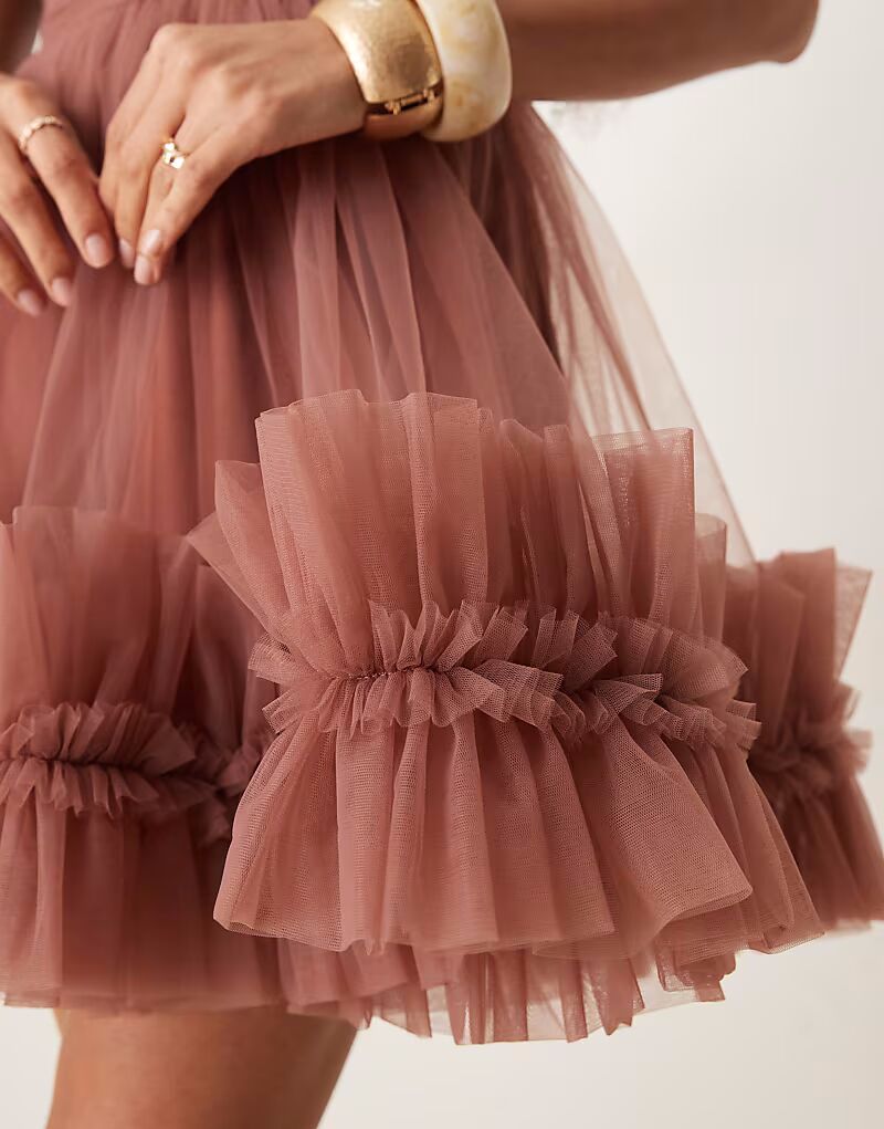 Платье-мини из тюля с кружевом и бисером, оборками по подолу, в форме сердца, розово-коричневого цвета Lace & Beads