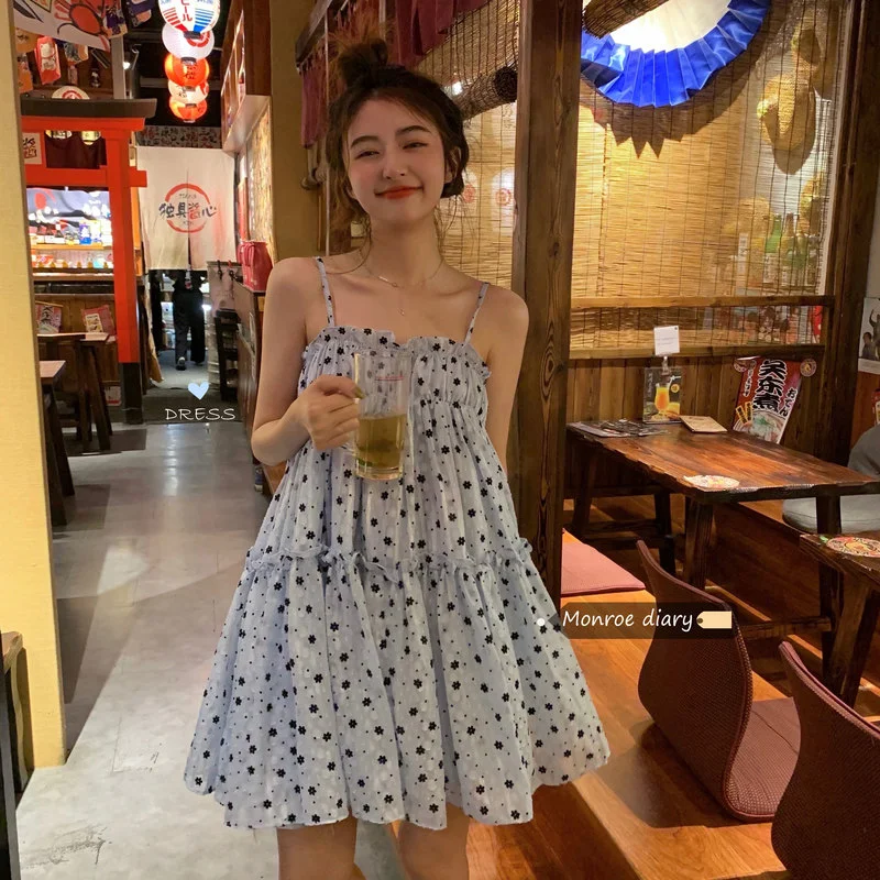 Платье на петельках синий Возраст для снижения Фея цветочное на лямках кукольная юбка женские новые летние небольшая трапециевидная корот...