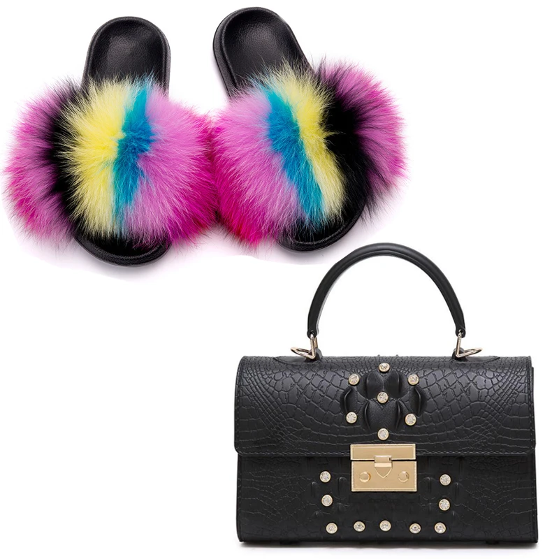 Hot Street Fashion Fur Slides Jelly Handbag Match Set Women Fantastic Crocodile Beach Bag Plush Fluffy Fur Slippers Girl Sandals