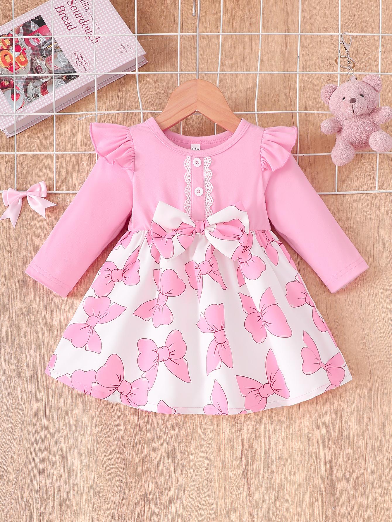 Платье с длинным рукавом и оборками для девочек, базовое с круглым вырезом, повседневное, мягкое платье с принтом для детей 9 розовый