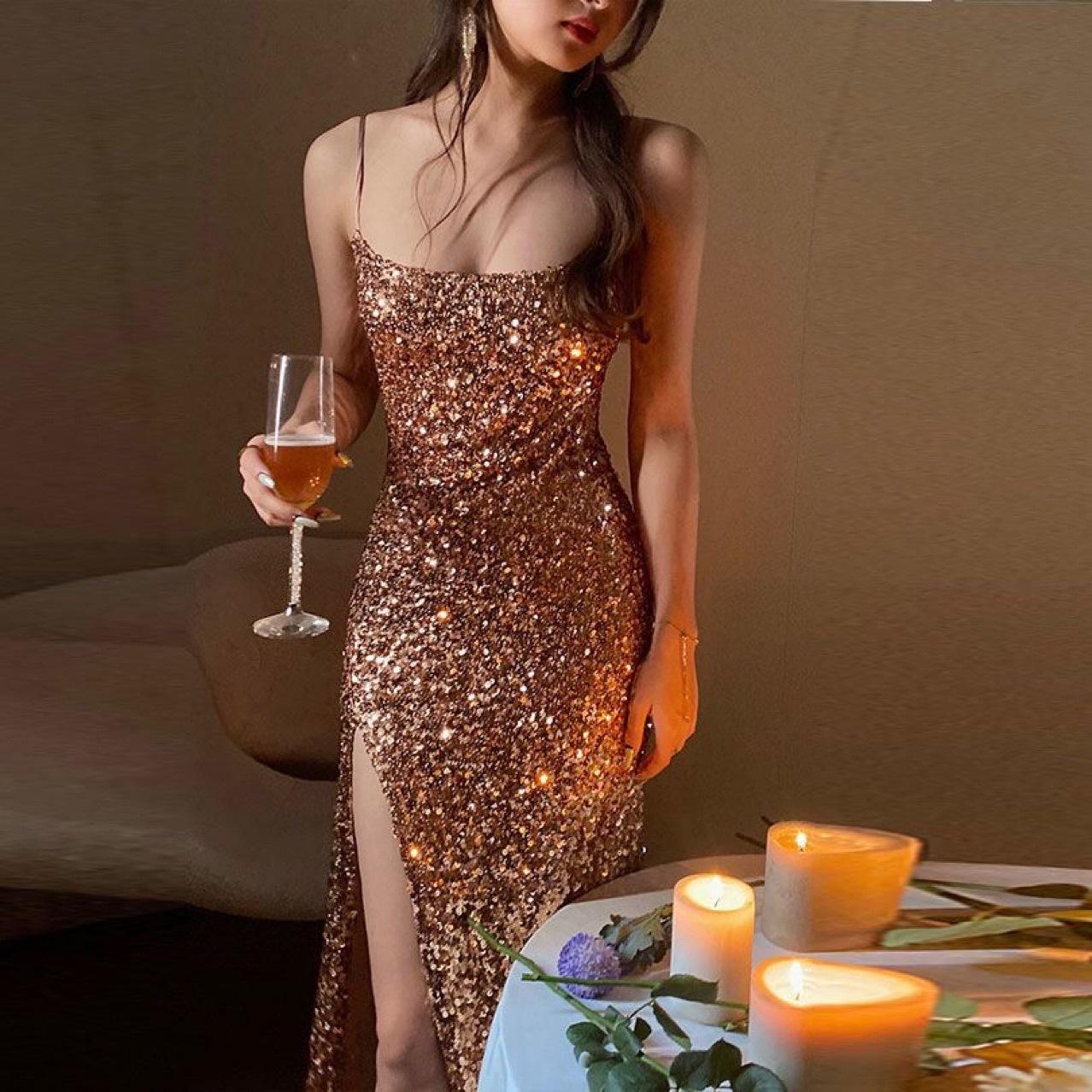 Платье с золотыми пайетками, женское сексуальное платье с разрезом, платье на бретельках, женское платье средней длины M золотой