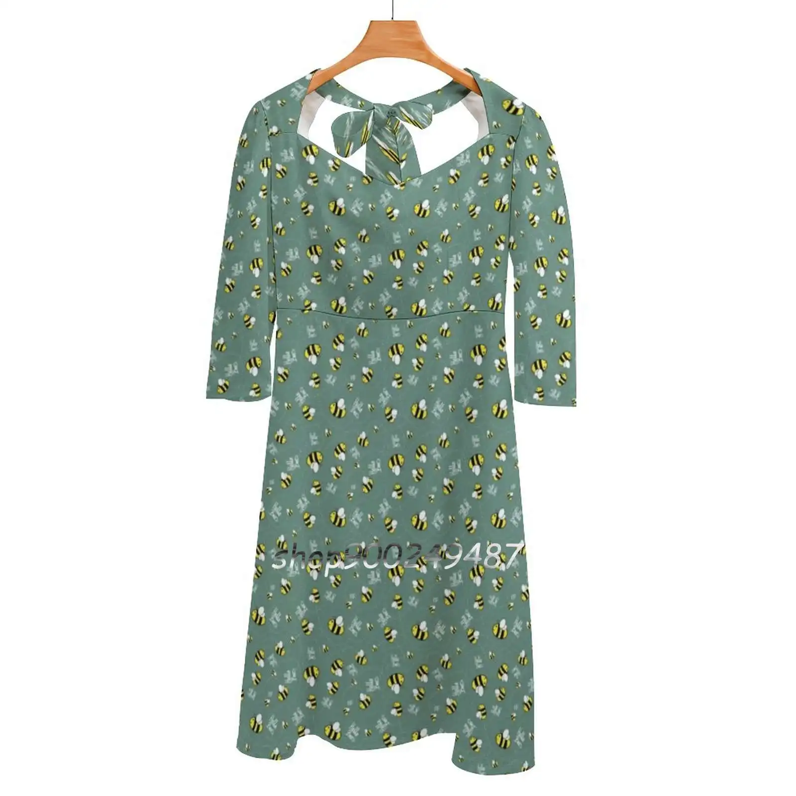 Платье с квадратным вырезом Hello Bees-зеленое, милые свободные платья с принтом, элегантное пляжное платье для вечеринки, платье с Пчелой, насек...