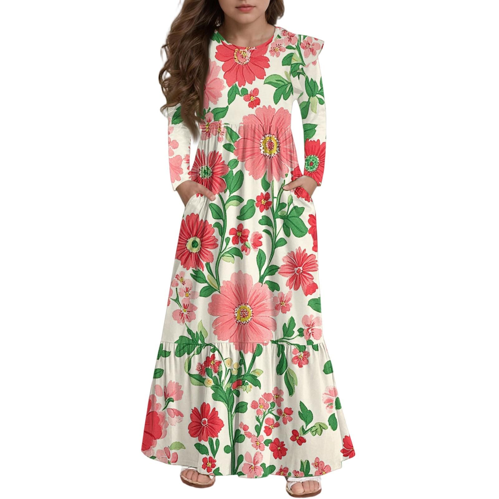 Платье с многоярусными оборками для девочек - Макси с длинным рукавом и принтом, с карманами 160 киноварь