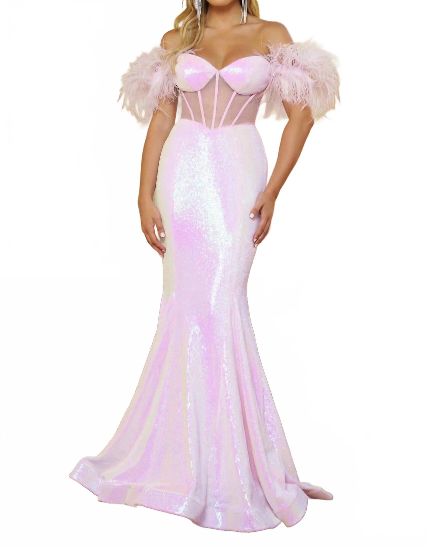 Платье с открытыми плечами и перьевыми деталями в переливающемся розовом оттенке Ava Presley