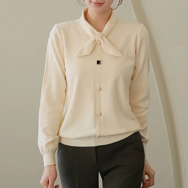 Women 2021 Spring New Fashion Pearl Button Knitted Sweater Long Sleeve Vintage Butterfly Collar Bow Tied Pullovers Chic Tops