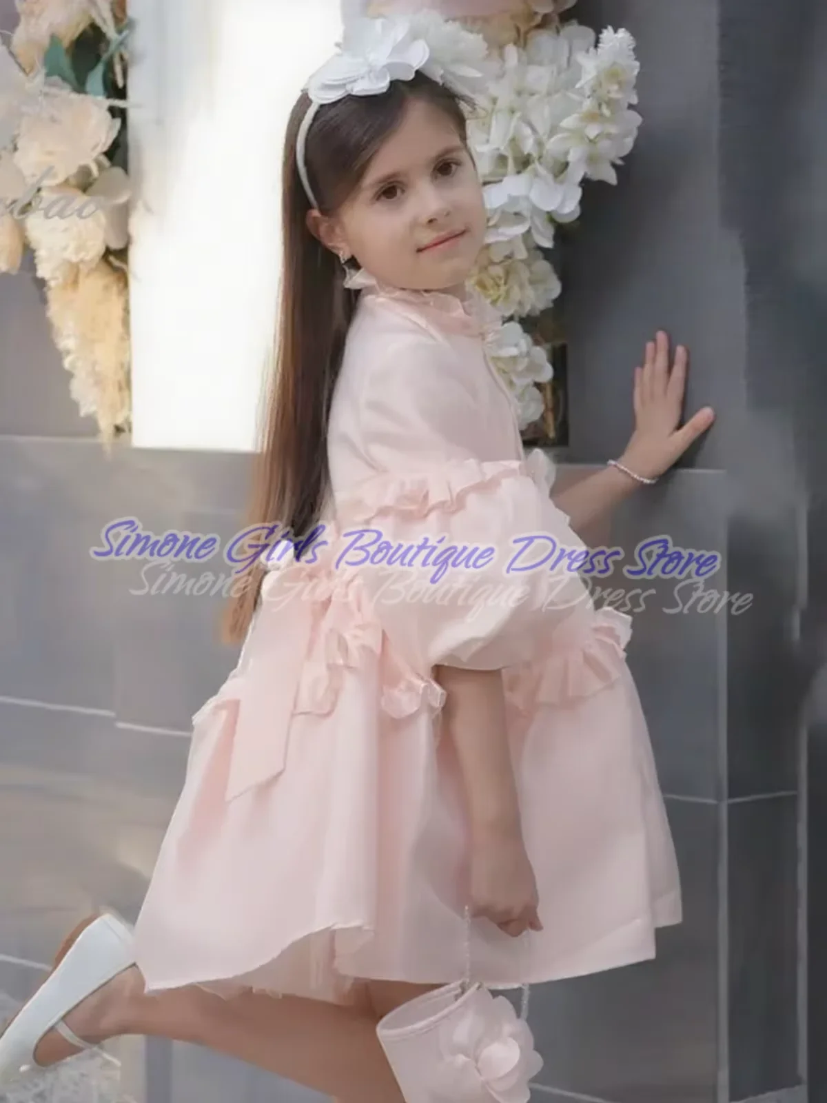 Платье с цветочным узором для девочек, атласное платье с высоким воротом и складками на половину пышных рукавов, официальное свадебное платье длиной до колена, вечерние платья принцессы на день рождения