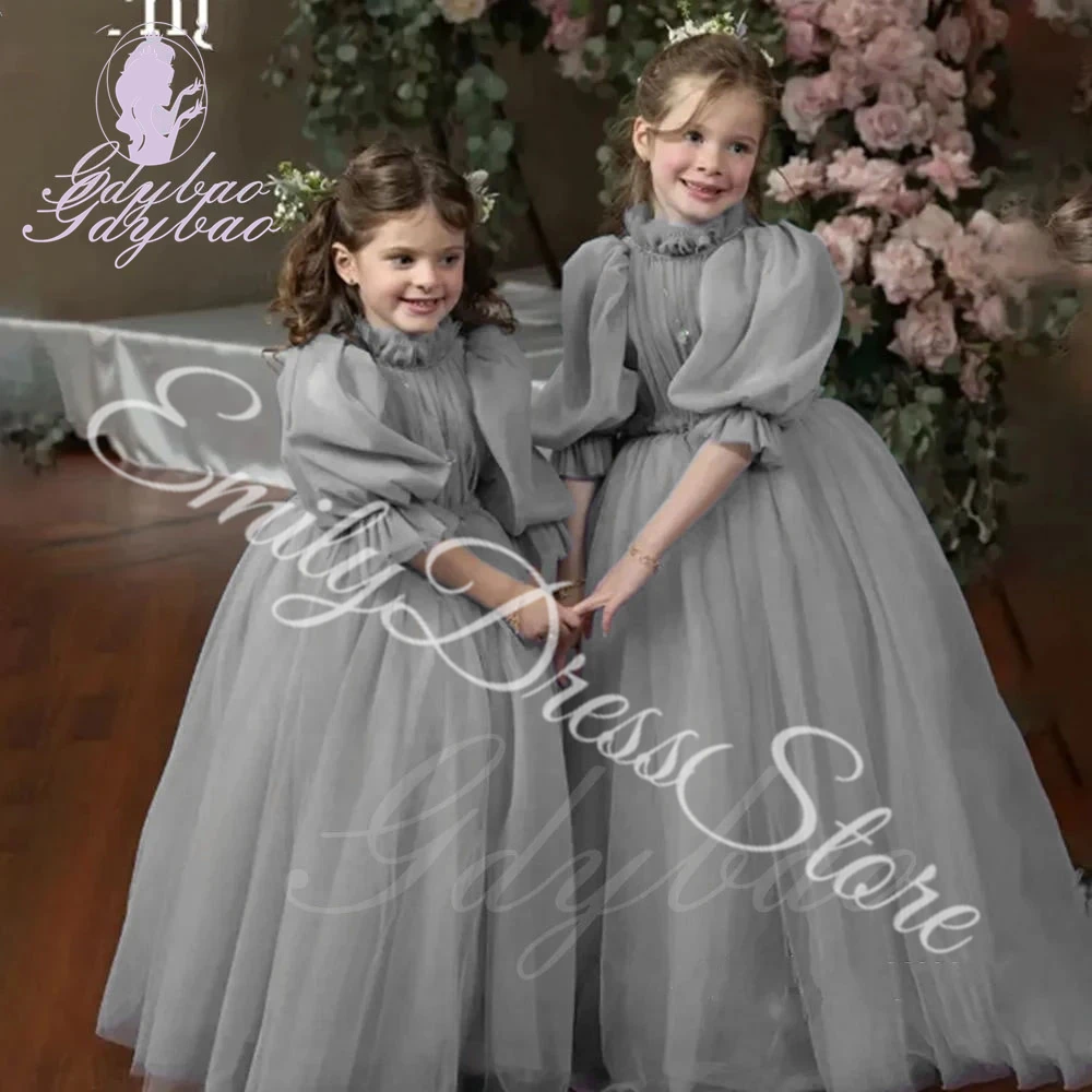 Платье с цветочным узором для девочек по индивидуальному заказу на свадьбу, розовое, фиолетовое, с высоким воротом, из тюля, плиссированное, пышное, детское бальное платье для первого причастия на день рождения