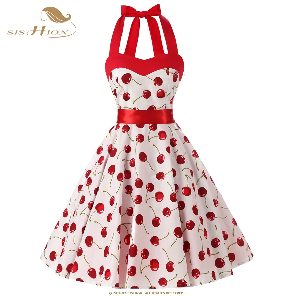 Платье SISHION черно-белое с лямкой на шее, без рукавов, с цветочным принтом вишни, в стиле 50-х годов, винтажное хлопковое пляжное, летние платья ...
