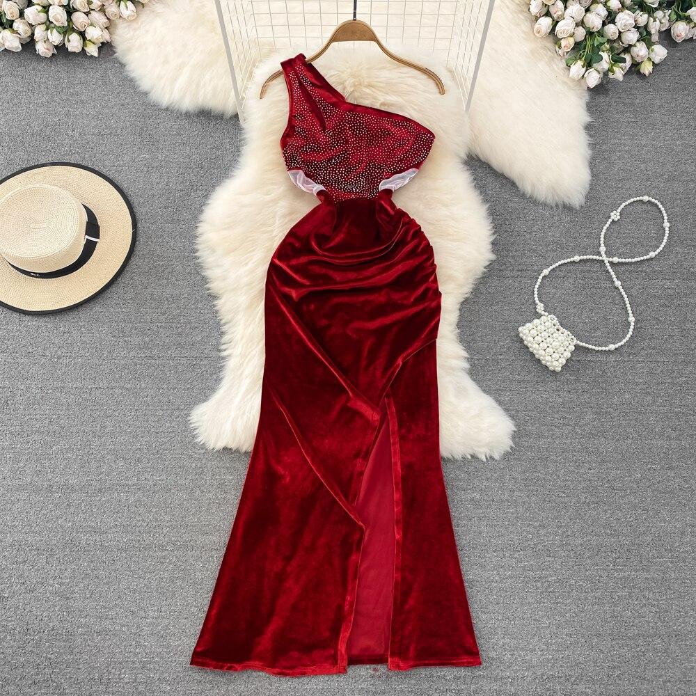 Платье Senior Sense в стиле ретро, темпераментное, на одно плечо, с талией, с тонким хвостом, бархатное блестящее платье с разрезом на талии