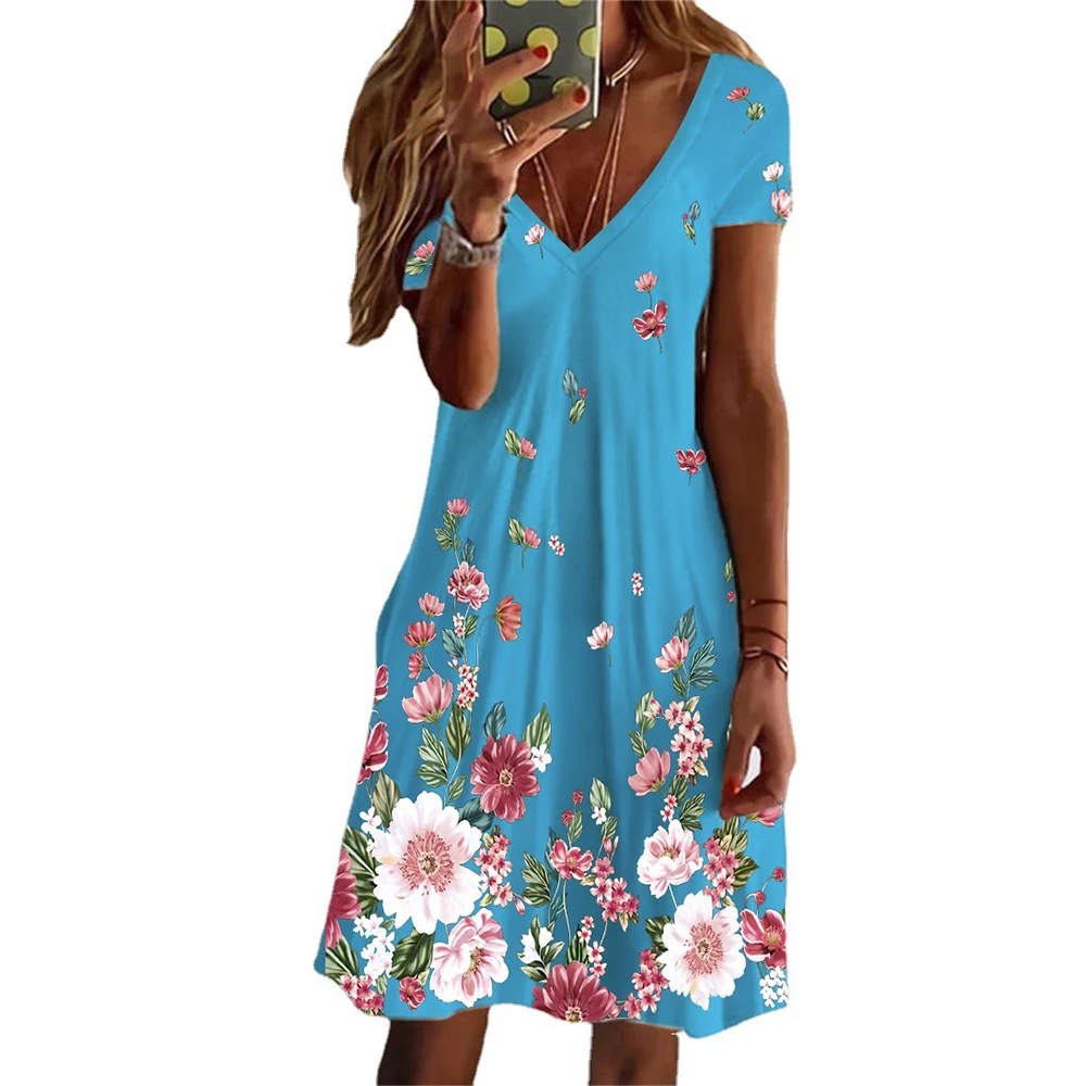 Платья для женщин, летняя модная пляжная одежда с V-образным вырезом, Повседневная Свободная Женская одежда, женское платье с коротким рукав...