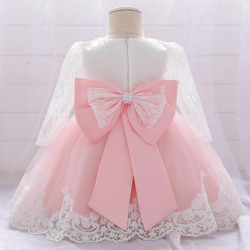 Платья для маленьких девочек Вечерние и свадебные кружевные платья с длинными рукавами и большим бантом для новорожденных девочек, платье принцессы на первый день рождения для девочек 90CM детские розовый