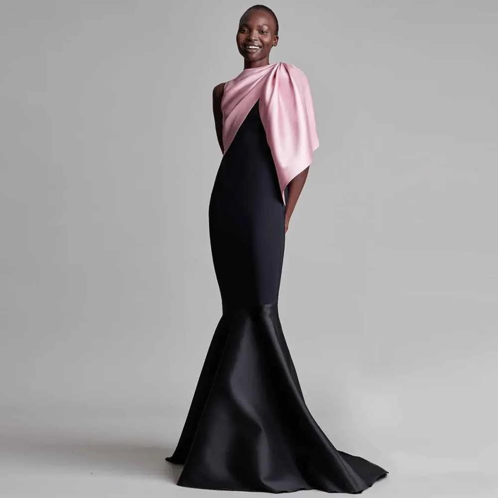 Платья для особых случаев 2025 г. Атласное платье русалки/трубы на День святого Валентина Черно-розовые платья для выпускного вечера со складками на одно плечо и рюшами