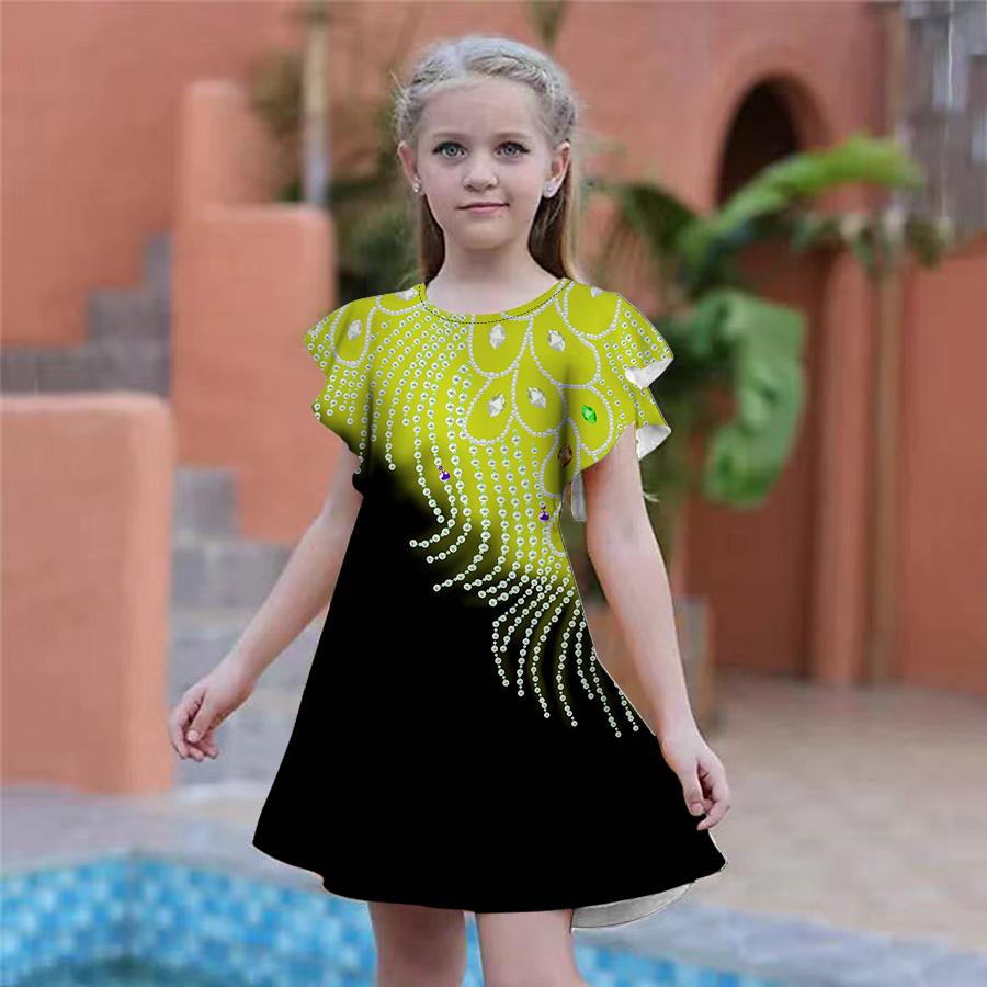 Платья с ромбовидным принтом и кисточками для девочек. Детское праздничное платье для девочек. Свободный крой. Свободная юбка с короткими рукавами для девочек старше четырех лет. 180 жёлтый