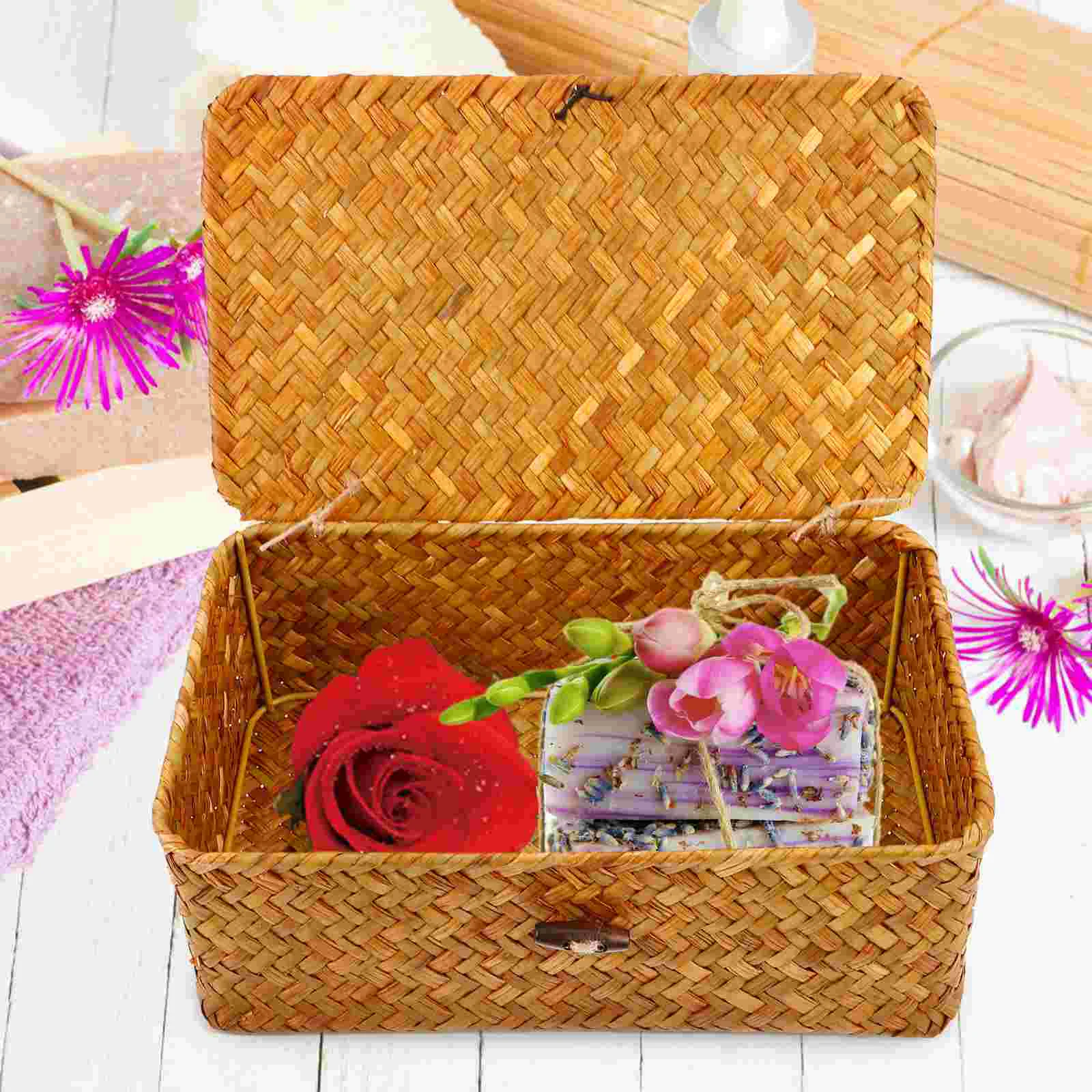 Плетеная коробка для хранения, корзина для белья с крышкой, Натуральная Зеленая Солома для рабочего стола