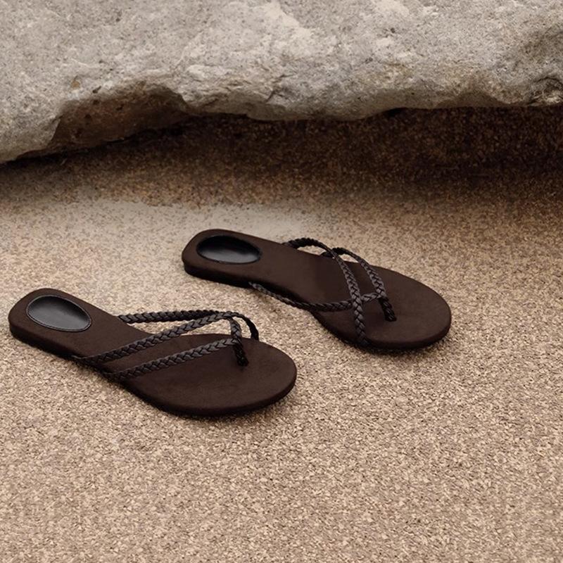 Плетеные прохладные шлепанцы лето новые ремешок на одно слово плоская подошва женские тонкий ремешок пляжные шлепанцы женские 40