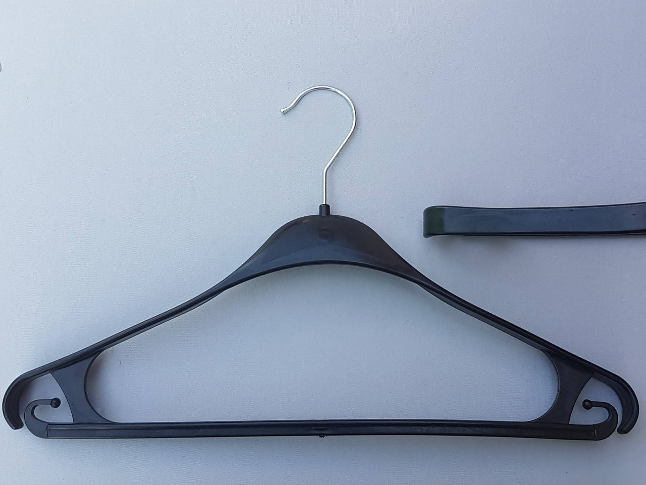 Плечик предназначен для тяжелой верхней одежды, имеет среднюю ширину плеча, по бокам есть зацепы. Прочный, удобный в использовании.