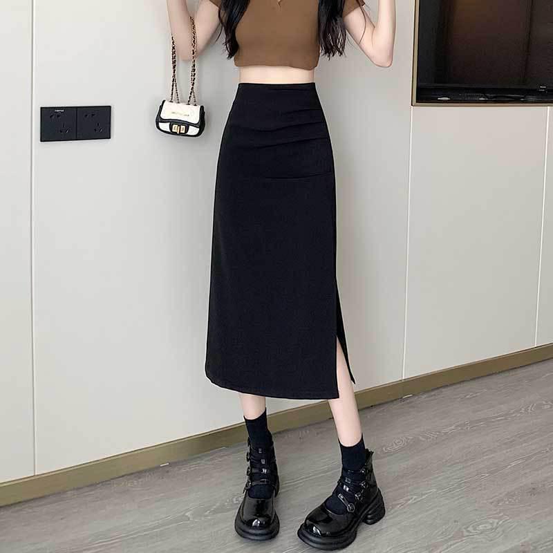 Плиссированная миди-юбка с разрезом и высокой талией - Женская летняя мода 2024, облегающая юбка, маленький размер L чёрный