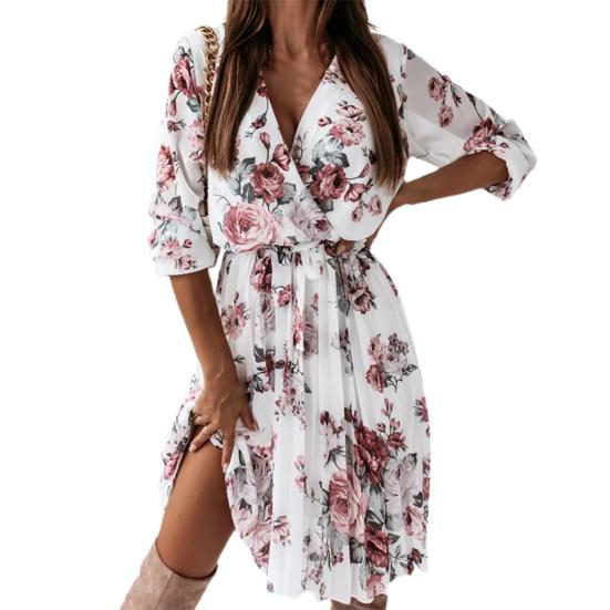 Плиссированное платье миди со струящимся подолом и цветочным принтом, милое повседневное платье с эластичной резинкой на талии и v-образным вырезом, уличная одежда M белый