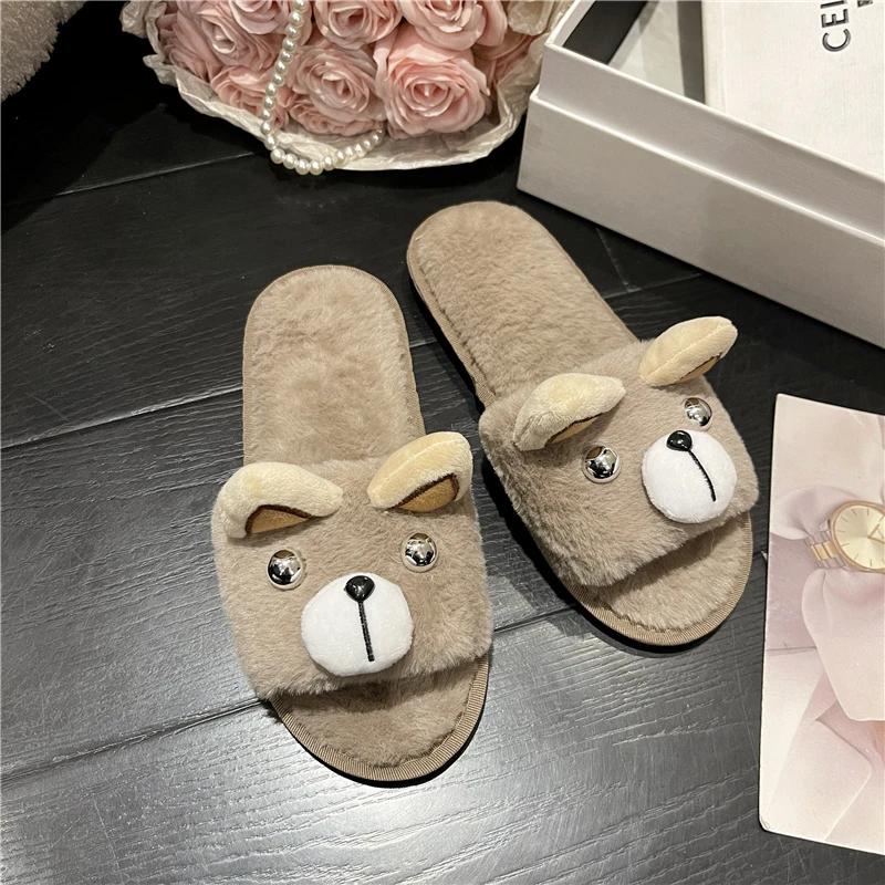 Плоские Пушистые Меховые Тапочки Женские Милые Собачки Животные Теплые Меховые Тапочки Женские Зимние Шлепанцы Домашние Слайды Плоские Домашние Тапочки для Пола 41 хаки