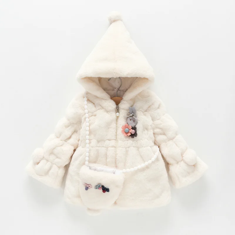 Плотная пушистая куртка на молнии для маленьких девочек, теплая плюшевая куртка с капюшоном и мешочком в виде кролика, осенне-зимняя одежда ...