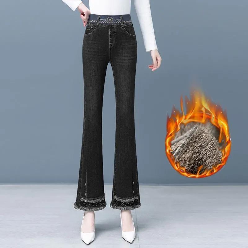 Плюс Бархатные Толстые Расклешенные Брюки Женские Зимние Теплые Эластичные Широкие Штанины Высокая Посадка Женские Джинсы Большого Размера Женские 33 чёрный