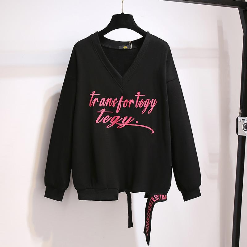 Плюс Размер Женская Новая Осенняя Свободная и Тонкая Толстовка С Принтом И V-образным Вырезом 3XL чёрный