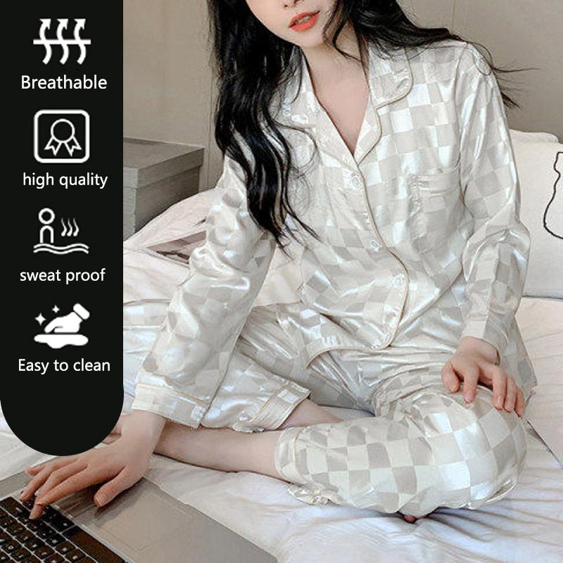 Плюс Размер Женский Пижамный Комплект Длинные Рукава Девочки Домашняя Одежда Из Двух Частей Кардиган Сплошной Клетчатый Пижамы Сексуальная Ночная Рубашка Осень Зима XXL белый