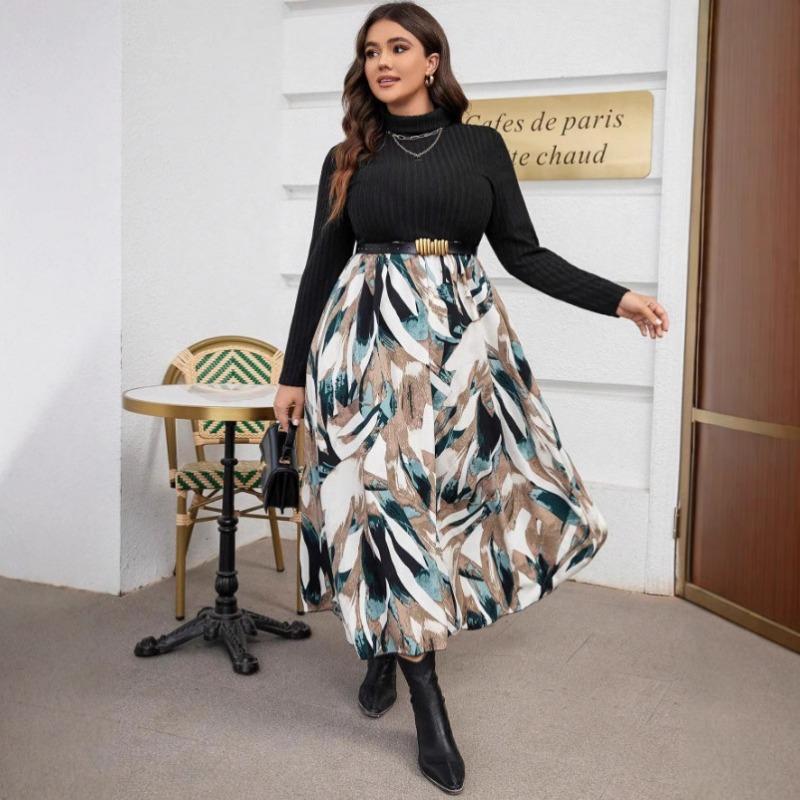 Плюс Размер Женское Новое Осеннее Платье С Напечатанным Цветом Соответствия Высокий Воротник Талия 2XL чёрный