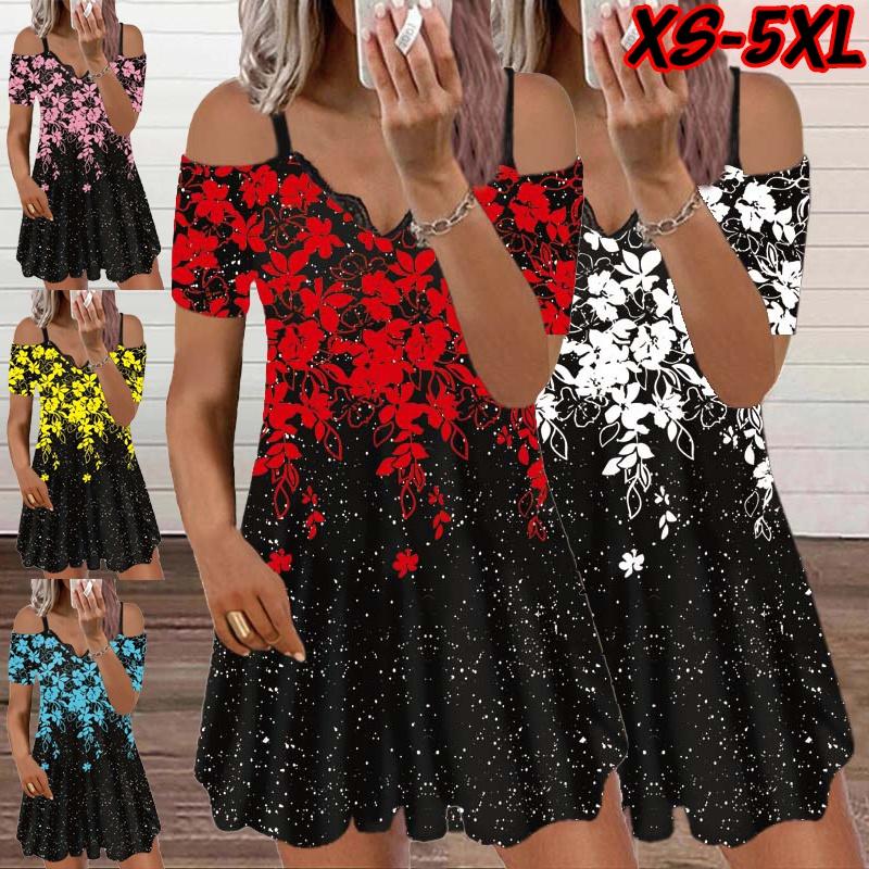Плюс размер модные женские летние платья с цветочным принтом удобные платья с короткими рукавами с открытыми плечами мягкие кружевные повседневные платья с v-образным вырезом
