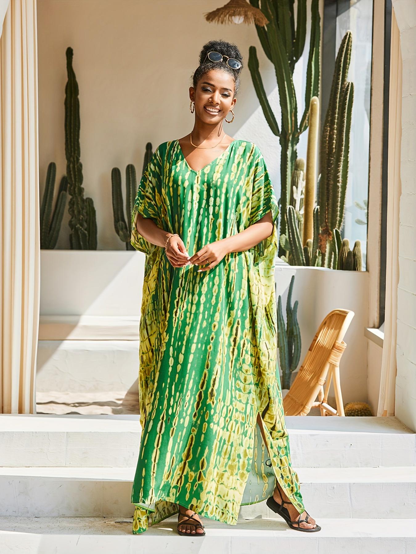 Плюс размер накидка в стиле бохо, женское пляжное платье в полоску с V-образным вырезом и рукавами «летучая мышь» плюс тай-дай One-size желто-зеленый
