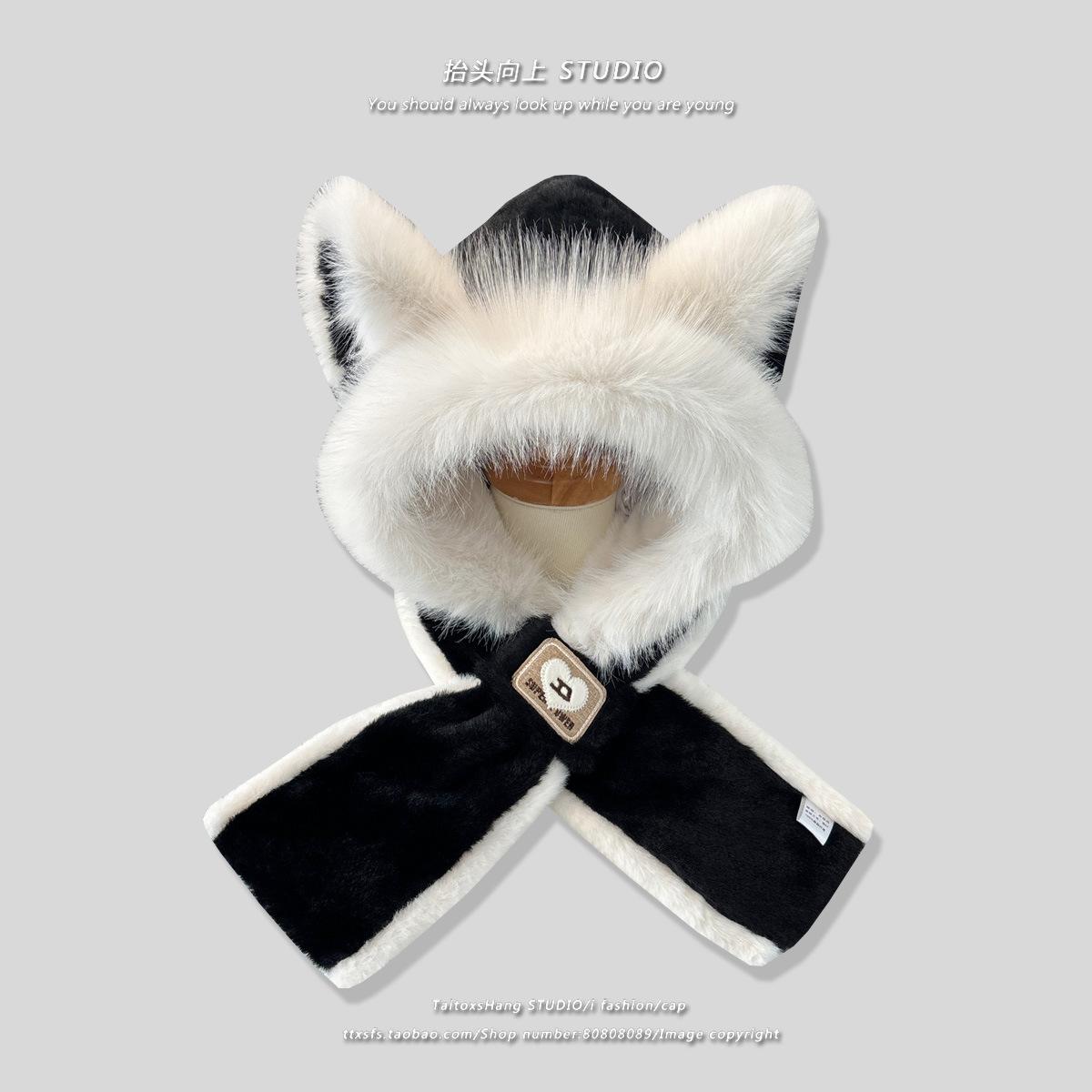 Плюшевая шапка для женщин на зиму с лисьими ушками, милый шарф, интегрированная шапка, плюс бархат, теплая, ветрозащитная, для езды на открытом воздухе average size