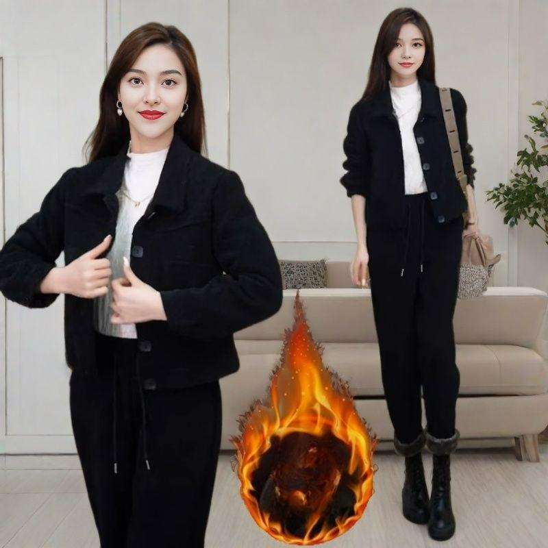 Плюшевый Утепленный Повседневный Костюм Женский Осенне-Зимний Модный В Западном Стиле Вельветовая Куртка Брюки-Шаровары Теплый Костюм-Двойка XXXXL чёрный