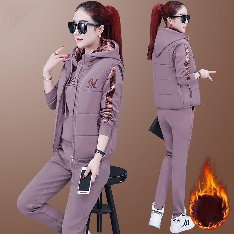 Плюшевый и утолщенный комплект для женщин, фиолетовое осеннее пальто для женщин, свитер с капюшоном для женщин, большой размер, теплый и модный комплект из трех предметов