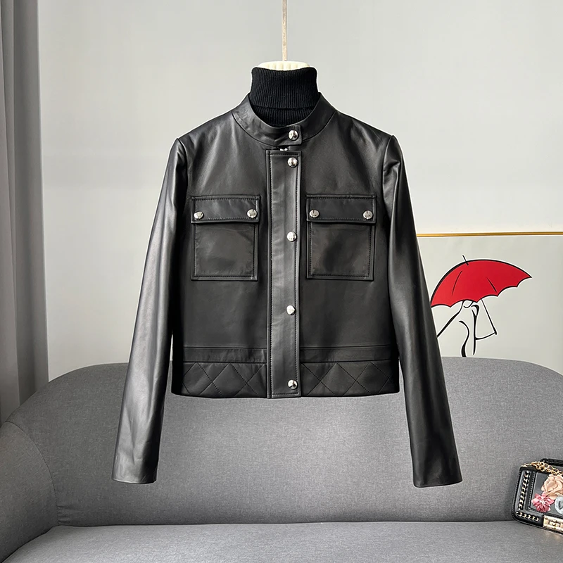 Women's Black Leather Jackets New Spring Autumn Rivet Biker Genuine Sheepskin Coats Fashion Streetwear CL4012